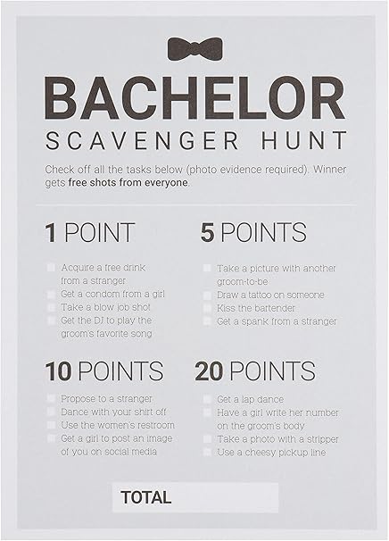 Amazon Com Juvale Bachelor Party Games 50 Pack Bar Scavenger Hunt Drinking Game And Dares Fun Novelty Cards For Boys Night Out Bachelor Party Supplies 5 X 7 Inches Home Kitchen - Rather than throwing the traditional bachelor party, we challenge you to be creative!