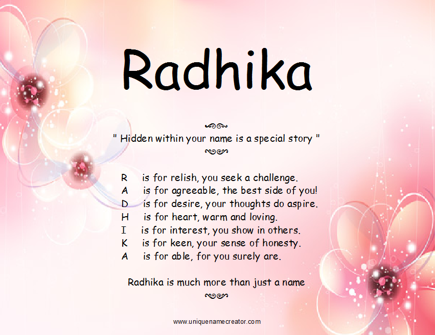 Radhika Name Meaning In English : R as in race (r.ey.s) ; Radhika Name Meaning In English / Radha, lover of lord krishna.